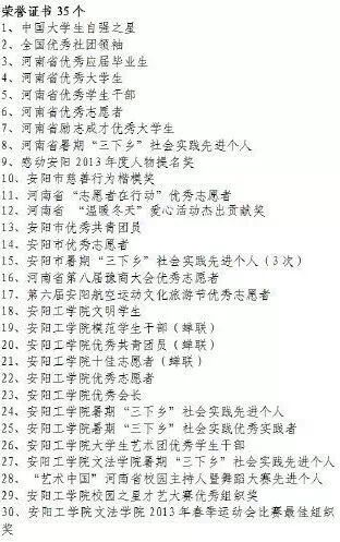 荣 誉证书35个,但是这些奖项中只有前5个有用,其他的对于企业来说仍然都是废纸。社会实践相当于大学的一个必修课,完成的好并获奖,只是说明这门课拿到了 较高的级点,足够用心。HR会觉得你确实是好学生,可以作为加分项。但是“春季运动会最佳组织奖”这个也算吗?想表现你很有组织能力么?小编不禁感叹:这 位童鞋你的求职意向到底是什么,你想要做什么呢?小编没有从你这些证书中看出来。要知道简历是根据求职意向来确定方向(突出能力的重点:组织能力,实践能 力还是动手能力)。其他与求职意向无关的证书不写要!!!
