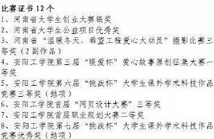 比 赛证书12个,而图片中的8个是这位童鞋特意挑选出来的。小编不得不说除了创业大赛银奖的证书含金量较高,其他证书真的太弱了。小编还记得大二的时候还拿 了运动会跳绳比赛第一名呢,没有什么代表性,学校的大赛及活动主要是娱乐性为主,所以这样的证书写在简历中,逼格何在?小编真的想问你的简历是用一张纸写 完的吗?(简历尽可能的在一张之上完成,简洁精干)。“暖爱杯”爱心故事原创是个什么鬼(⊙o⊙)…貌似这位同学还是暖爱网的主编,难道有黑幕。童鞋你是来搞笑的吗?