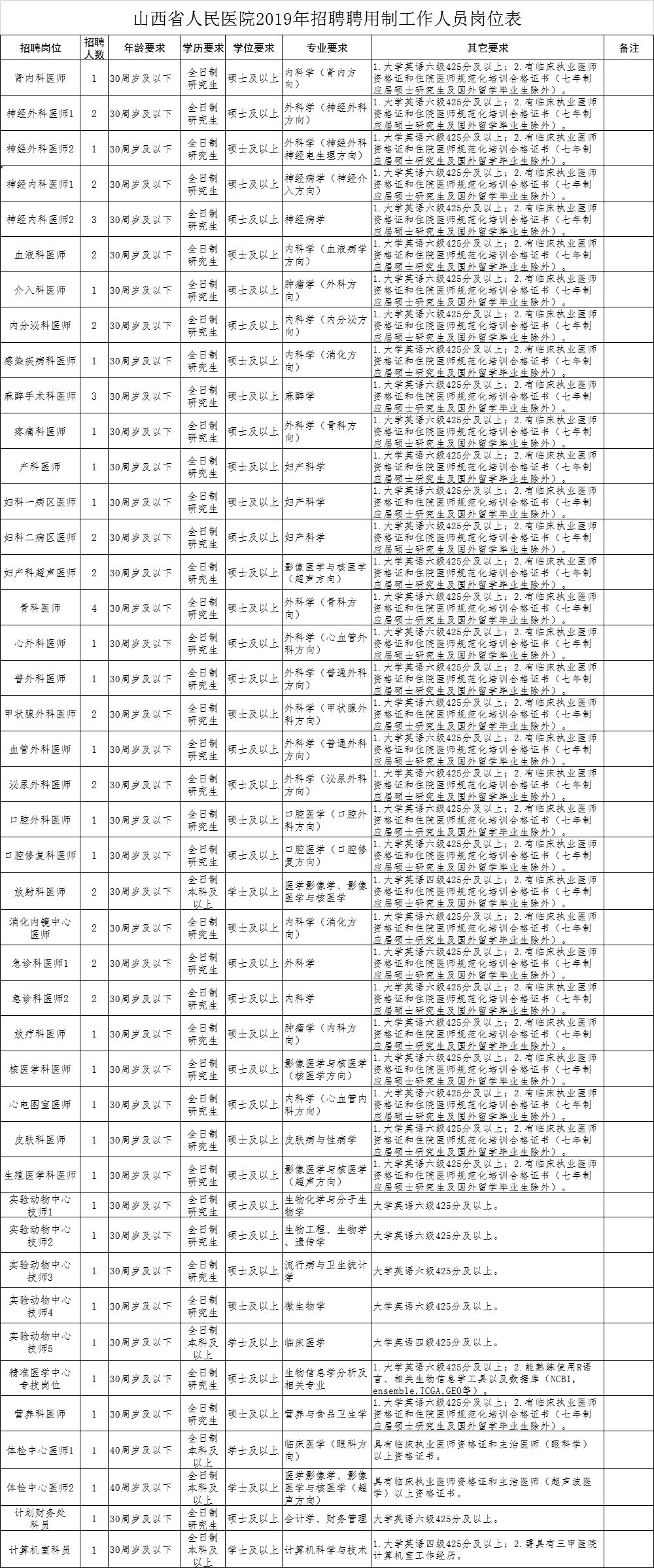 6.年龄要求:40周岁及以下(即1978年12月18日及以后出生); 30周岁及以下(即1988年12月18日及以后出生)。2.因犯罪受过刑事处罚的、被开除中国共产党党籍和公职的;在立案审查期间或未解除党纪、政纪处分的人员,不能报考;3.各级公务员招考和事业单位招聘中被认定有舞弊等严重违反考录、招聘纪律行为的人员,不能报考;4.试用期内的公务员(参照公务员法管理事业单位工作人员)和试用期内的事业单位工作人员,不能报考;5.招聘为事业单位工作人员有服务年限规定且服务期未满的,不得报考;6.在原单位出现重大医疗事故或被吊销执业执照的人员不能报考;7.被依法列为失信联合惩戒对象以及法律、法规规定不符合本次招聘要求的人员,不能报考;应聘者在报名之后、聘用之前已成为试用期内的公务员(参照管理单位工作人员)或已被聘用为事业单位工作人员的,不予聘用。招聘条件或岗位要求的辞退、现役、试(聘)用期、服务期、各类从业(职业、执业)资格证书等的截止时间,除岗位有明确要求外,均为公告发布之日。我院2019年招聘聘用制工作人员62名,招聘岗位所需的具体条件以《山西省人民医院2019年招聘聘用制工作人员岗位表》(以下简称《岗位表》)的要求为准。